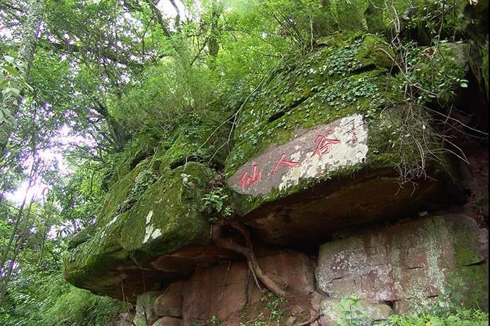 仙人谷里树木苍郁、奇石林立,山涧清泉潺潺、万鸟争鸣不竭、摩崖石刻随处可见,是探险、寻宝、修身养性的绝佳之地。谷中有一景点叫“仙龟出洞”,因一块天然岩石酷似仙龟刚刚从山洞里探出大半个身子的样子而得名。仙龟上方有一朵灵芝石,称万年灵芝,传说龟吃了灵芝才成仙的,这里景色怡人,颇有“灵气”。