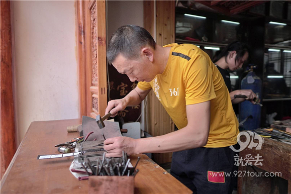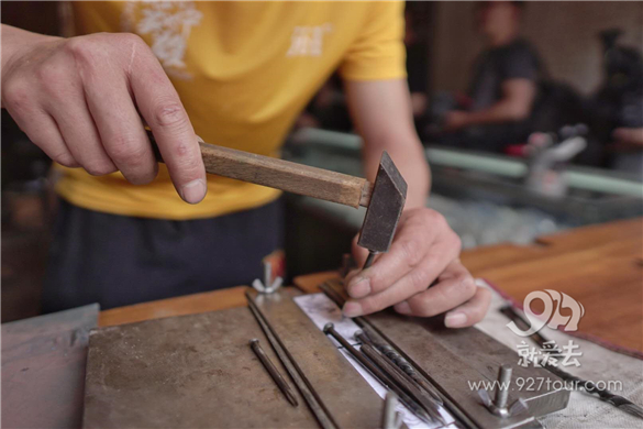 刚做成的工件呈红铜色,但与人体汗液接触后,红铜色即变乌色,而浇灌在刻痕里的白银就显得更加晶莹白洁,“乌铜走银”因此得名。