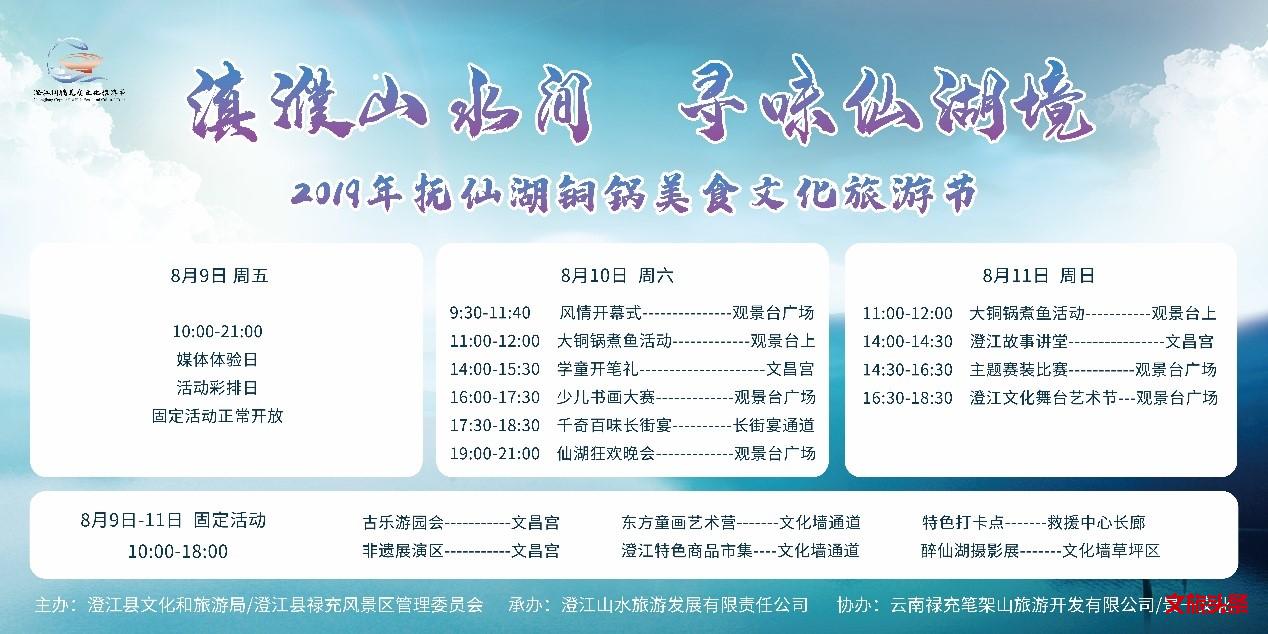 近日,2019年抚仙湖铜锅美食文化旅游节的最终活动流程发布,活动共持续3天,从8月9日至11日,设置了“古韵风情”“澄江文市”“澄江艺市”和“澄江互市”四大板块十余项系列活动。