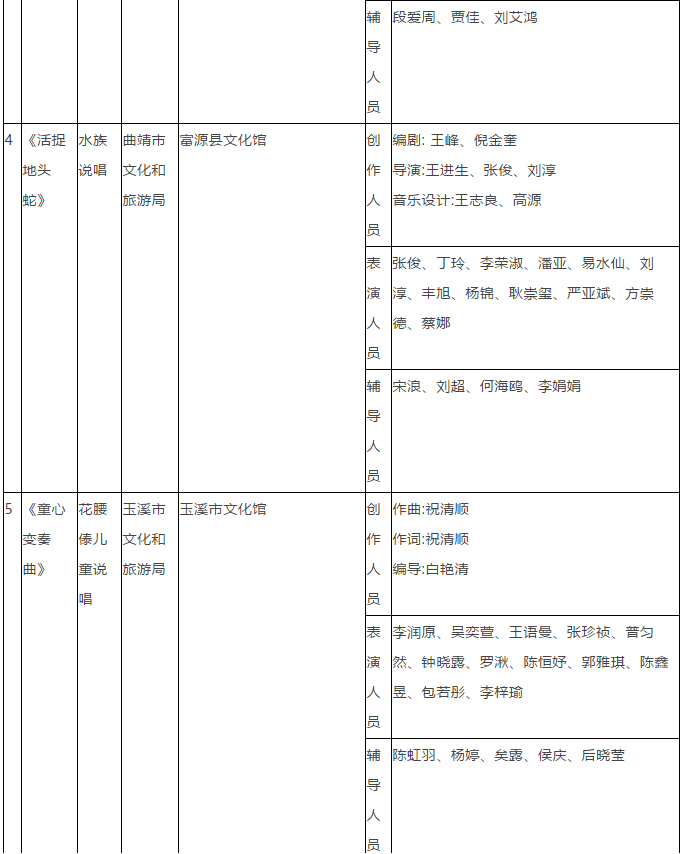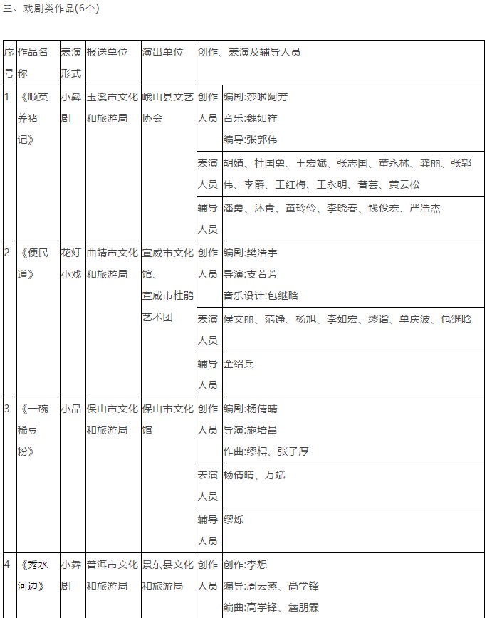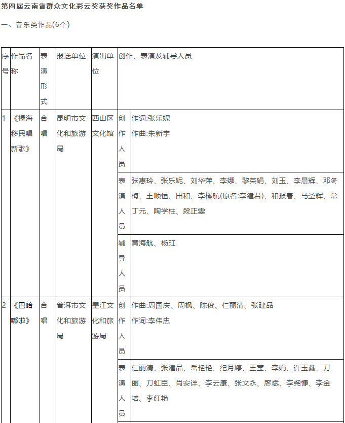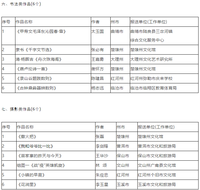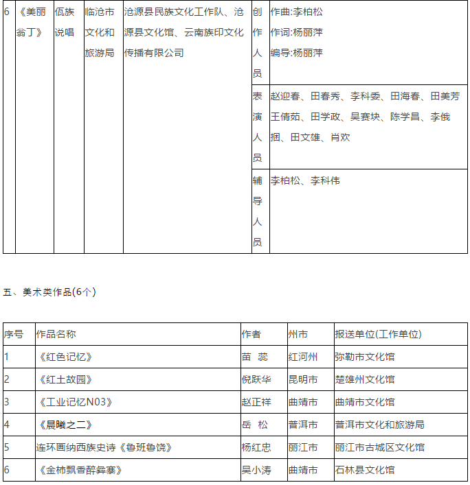 “彩云奖”是云南省群众文化的最高奖项,与国家文化和旅游部设立的群众文化最高奖“群星奖”对应衔接。本届彩云奖以“繁荣群众文艺创作、讲好云南故事、记录云南文化发展、展示云南文化成就”作为基调,自今年启动以来,全省16个州市通过层层选拔,共报送音乐、舞蹈、戏剧、曲艺、美术、书法、摄影七个艺术门类作品1676个参加复赛,最终共有388个作品进入决赛。根据《云南省群众文化彩云奖评奖办法》有关规定,云南省文化和旅游厅开展了第四届云南省群众文化彩云奖评奖工作。经审核,形成了第四届云南省群众文化彩云奖获奖作品名单,并予以公示,公示期自10月26日至11月1日。