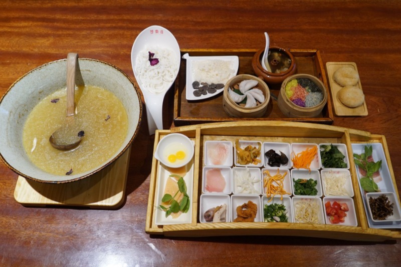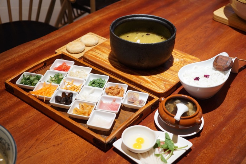 此外,这三款过桥米线,在配菜和盛装的器皿上也各有特色。土鸡过桥米线中包含13道配菜,火腿过桥米线中包含18道配菜,野生菌过桥米线中包含21道特色配菜,不仅涵盖传统固有荤素食材,更有着创新搭配,只为一口好味。盛高汤的器皿均是云南特有的陶器和瓷器,让你真切感受到,过桥,就是过生活。