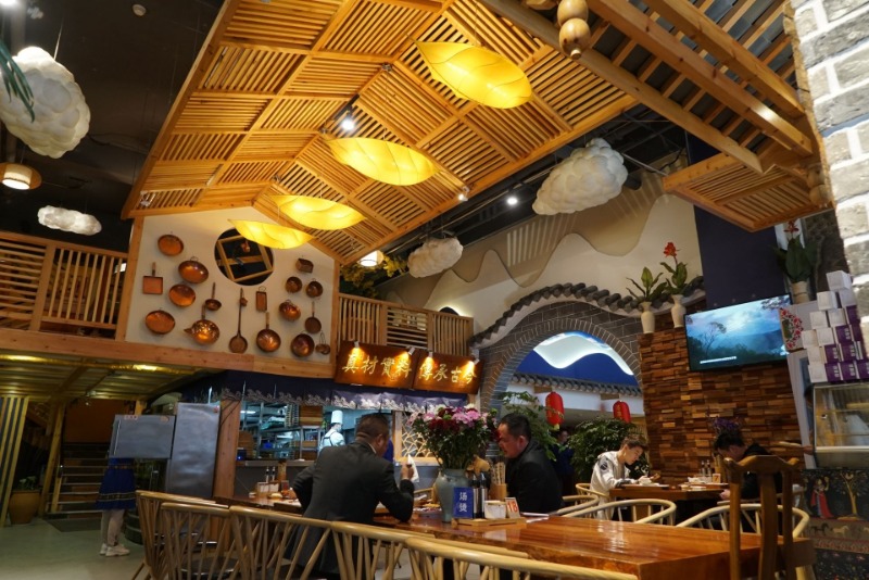 在800多平方米的店面里,随处可见云南民族文化缩影。进门就是浓浓的民族风韵,青砖瓦黛、高山绿水、祥云蓝天……墙面上挂满了云南特色铜器具,实木座椅,古香古色。